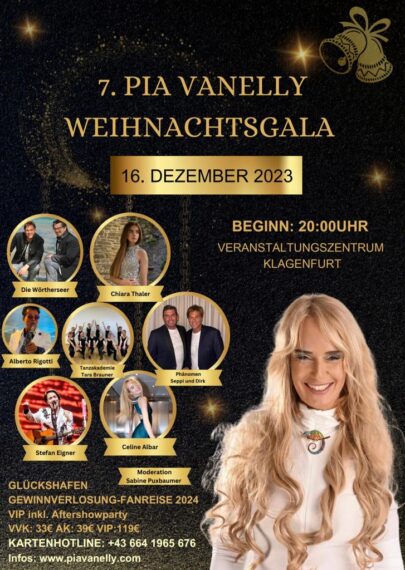 Weihnachtsgala, einem unvergesslichen Abend voller Glanz, Glamour und festlicher Stimmung! Wir freuen uns, Ihnen eine außergewöhnliche Veranstaltung präsentieren zu dürfen, die mit einer Reihe von fantastischen Gästen aufwartet.Lassen Sie sich von der bezaubernden Stimme von Pia Vanelly verzaubern, während sie bekannte Weihnachtsklassiker und ihre eigenen Hits performt. Ihre unglaubliche Bühnenpräsenz und ihr Charisma werden Sie in den Bann ziehen und für eine unvergessliche Atmosphäre sorgen.